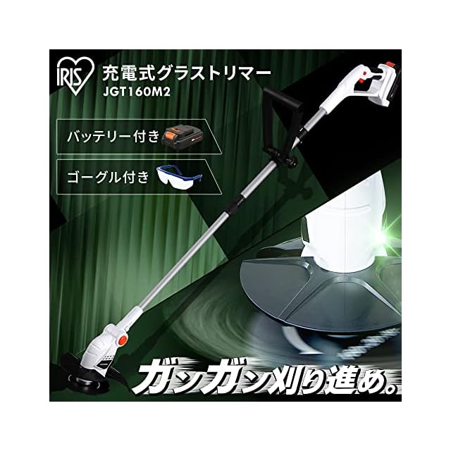 アイリスオーヤマ 草刈り機 充電式 金属刃 18V 連続使用時間60分 跳ね返りを防げる 安全カバー付き 充電池 充電器付 ゴーグル ナイロン刃 肩掛けベルト付 【共通バッテリーシリーズ】 JGT160M2