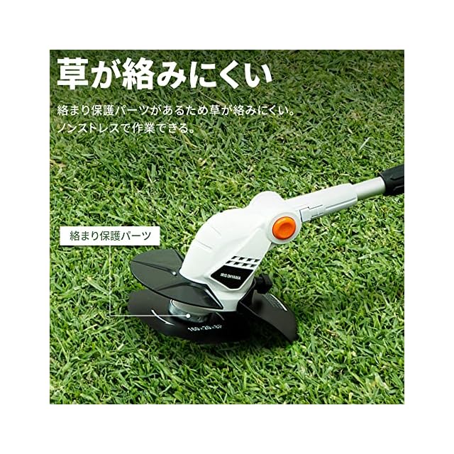 【使いやすい】補助ハンドル、ポール、ヘッド部分を調整できる。さらに肩掛けベルトで重みを分散できて、楽々刈れる。【安全機能】・フロントガード:キワ刈りも安心。障害物から刃を守る。・安全カバー:高速回転する刃から体を守る。