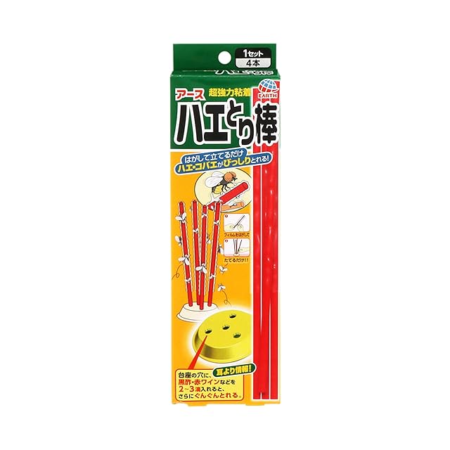 粘着棒の色と誘引効果でハエやコバエ(ショウジョウバエ・ノミバエなど)を誘い粘着捕獲。