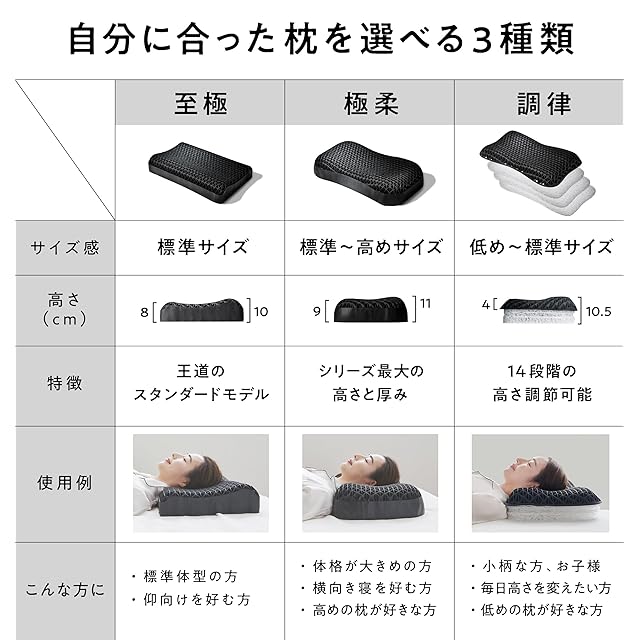 【使用上の注意】枕の使用により首や頚椎に違和感を感じた場合は、無理に使用を続けず、一度ご使用をお控えください。症状が続く場合は医師にご相談ください。枕の感じ方には個人差がありますので、ご自身に合った使用方法でお試しください。