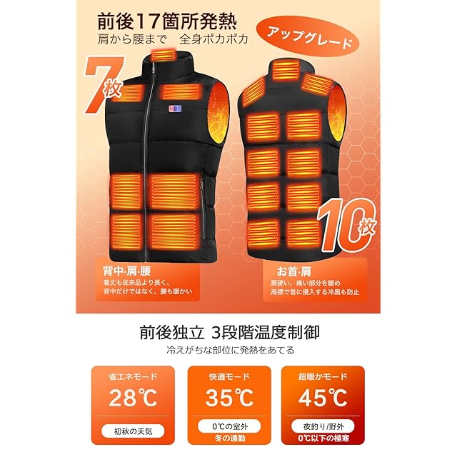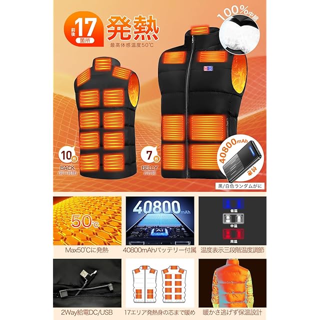 【前後17箇所 ヒーターベスト】※「電熱ベスト+モバイルバッテリー(色はホワイト/ブラックランダムがに)」2点セット※ 前に6つ、後ろに11つの内蔵ヒーターを備え、寒い季節でも快適に暖かく過ごせる発熱ベスト。ヒーターを発熱させて温めるような感覚で身体を暖かく保ち、日常生活の通勤通学、自転車/バイク運転や、アウトドア活動、屋外作業などに広く利用されており、厳しい冬の寒さから身を守る理想的な防寒アイテムです。