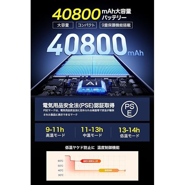【40800mAh大容量バッテリー付属】USB給電タイプの電熱ジャケットで、バッテリーに接続して、内蔵ヒーターを発熱させることで暖かく使用します。大容量モバイルバッテリーを付属し、高温モードでも長時間持続発熱することが可能、寒い朝や外出時に瞬時に暖かさを提供してくれます。メンズ、レディース問わず、冬場でのお出かけ、釣り、スポーツ観戦、スキー、登山、工事現場、警備など色々活躍し、どこでも長時間の暖房を楽しむことができます。