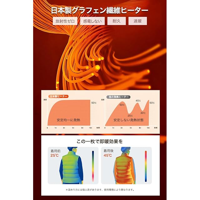 【時短・速暖・保温 丸洗いOK】日本製グラフェン繊維ヒーターを採用し、電源を入れた後、約10秒ぐらい温まり始め、暖かさが素早く広がります。中身にふんわりした中綿入り、ヒーターとの組み合わせで熱を逃さず、しっかり暖かさをキープし、寒い外を歩いても体がポカポカ。ただの中綿入りベストとして普通に着ていても暖かいです。汚れたら、USBコードをポケットに入れて、手洗いや洗濯機で丸洗いできます。