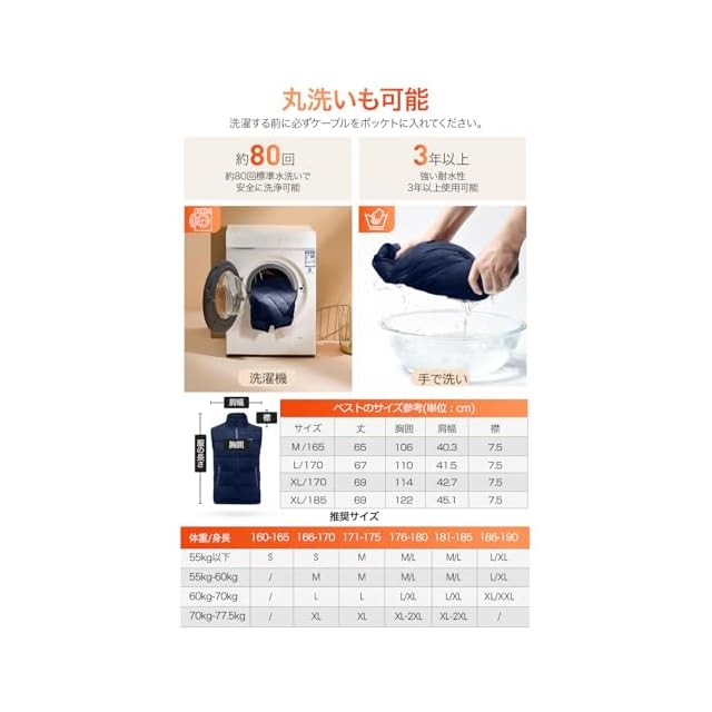 【4サイズ展開 男女兼用】M、L、XL、2XL。人によって、サイズ感の差異があるので、画像のサイズ表をご参考ください。【パッケージ内容】電熱ベスト(USBコード付き)、取扱説明書(書付き)。【一年安心】万が一、初期不良やその他不具合が生じた場合は、商品ページの販売店舗名をクリックして、「質問する」ボタンより店舗までご連絡いただければ迅速に対応いたします。