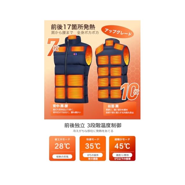 【前後17箇所 ヒーターベスト】※電熱ベストのみ、バッテリーは別売り※ 前に6つ、後ろに11つの内蔵ヒーターを備え、寒い季節でも快適に暖かく過ごせる発熱ベスト。ヒーターを発熱させて温めるような感覚で身体を暖かく保ち、日常生活の通勤通学、自転車/バイク運転や、アウトドア活動、屋外作業などに広く利用されており、厳しい冬の寒さから身を守る理想的な防寒アイテムです。