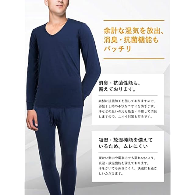 汗を熱エネルギーに変えるから、着ているだけで暖かい:体から出る汗を繊維が吸収し、熱エネルギーに変換。「繊維が熱を発生させる」ことが暖かさの秘密です。研究を重ねた繊維が、あなたの身体を暖めます。極細の繊維が、空気の層を作るため、保温性にも優れております。