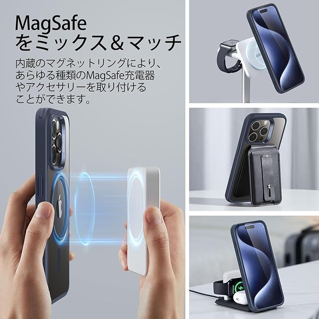 【高級磁石N52M付き・MagSafe対応】ESR iPhone 15 Pro Max 用 ケースは1,500 gの吸着力を持つ強力な内蔵磁石により、iPhone 15の8倍以上の重量を吸着可能です。それにより、多種なマグネットアクセサリーとの素晴らしい組み合わせを実現でき、ガッチリ吸着する事でスマホケースを装着した15 Pro Maxを急速にワイヤレス充電できます