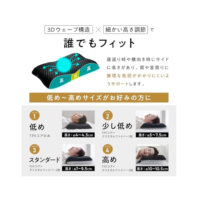 【使用上の注意】枕の使用により首や頚椎に違和感を感じた場合は、無理に使用を続けず、一度ご使用をお控えください。症状が続く場合は医師にご相談ください。枕の感じ方には個人差がありますので、ご自身に合った使用方法でお試しください。