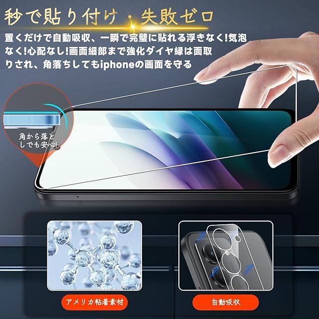 【高品質の材料の9H硬度】とレンズ保護フィルムはすべて旭硝子で作られており、スマホ保護フィルムの中で最高レベルの9H硬度に達しています、4.5時間以上の高温焼入れ処理を行い、スクリーンプロテクターの圧強度は 125mpa に達し、通常 ガラス の 5 倍になりました。しかもスクリーンプロテクターは衝撃を抑えるシリコンコーティングを内蔵しており、万が一ガラスが割れても、ガラスの破片が飛散しません。ハードコーティング技術は、衝撃を最小限に抑えて画面の破損を抑え、すり傷防止や指紋防止もしっかりとスクリーンを保護します。*大切な携帯電話の液晶画面を保護し、衝撃や表面のキズを防止します。