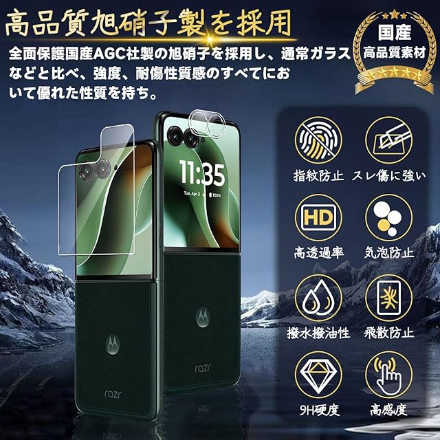 商品名:対応 MOTO RARZ 60 V ガラスフィルム 指紋防止 【2* フ ィルム + 2* レンズ保護フィルム+ 1*クリーニングツール】国産旭硝子材質 RARZ 60V 薄型 強化ガラス 保護 高光沢 液晶 RARZ60 V ケース 9H硬度 厚さ0.26mm超薄型 高透過率 気泡なし SENXLL-RARZ 60VG04