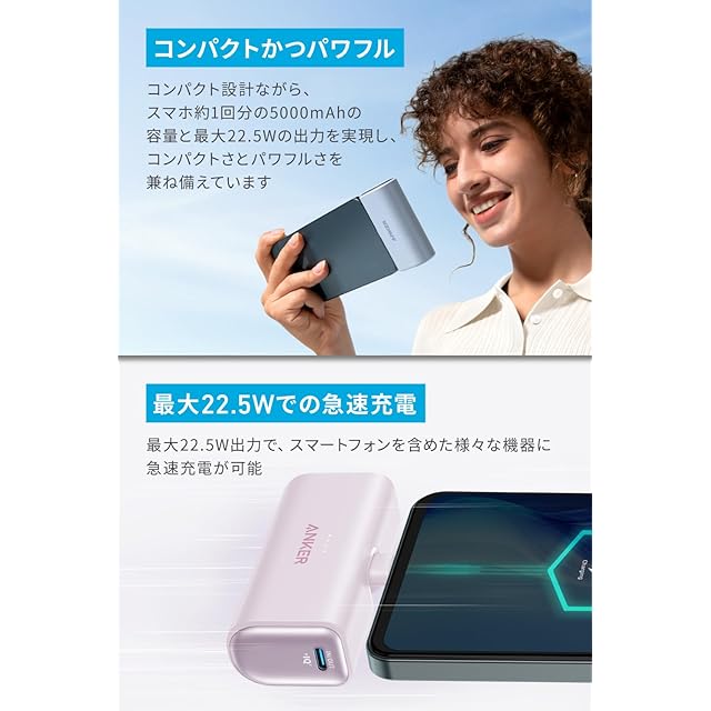 商品名:Anker Nano Power Bank (22.5W, Built-In USB-C Connector) (モバイルバッテリー 5000mAh 小型コンパクト)【PowerIQ搭載/USB-C一体型】 iPhone 17 / 16 / 15 シリーズ/Switch 2対応 (パープル)