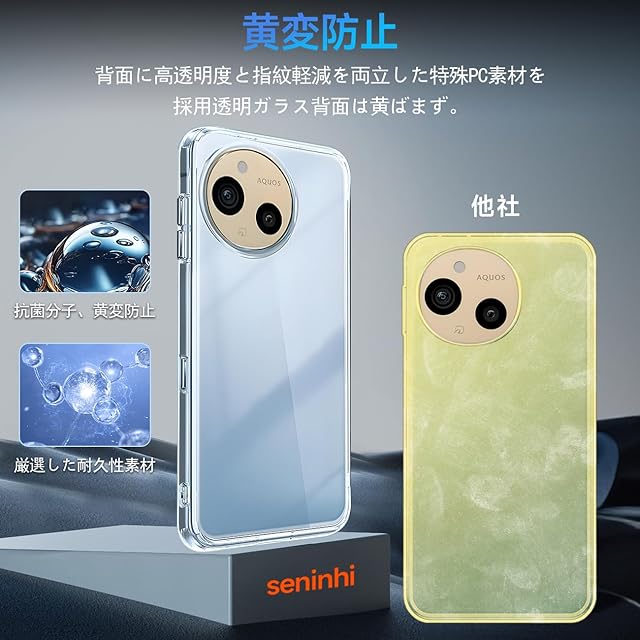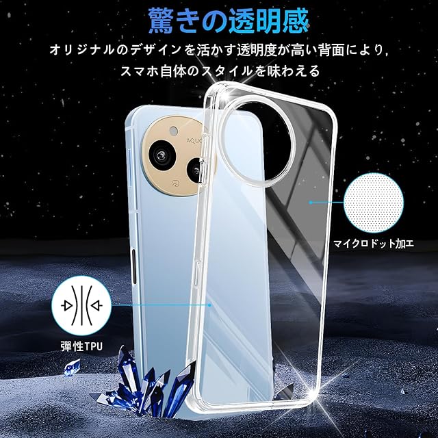 【優れた精度】AQUOS SENSE9 ケース 薄くて頑丈で、程よいグリップ感があり、できるだけスマートフォン本体のスリムさを極力損なわないように設計した透明背面ケースです。位置、及び全てのスピーカー、ポート、ボタンを精密に設計しており、充電、及びヘッドフォンで音楽を聴いても機能的な使用を妨げなく、携帯電話に負荷をかけなく、簡単に取り付けることができます。【完全透明・上質な透明感】 超精密な光透過分子を備えて、後ろの光透過率は 99% に達します。後ろのポリカーボネートの耐用性と耐摩耗性が抜群です。本来の美しさや高級感を影響しなく、シルクと全く同じ風合いで、涼しい触る感じがあります。誰にでも適用し、夢中になってしまって触りたくなります。