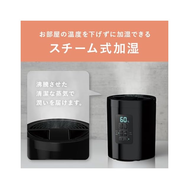 沸騰させた蒸気で清潔なミストを飛ばし、すぐに部屋全体に潤いを届けるスチーム式加湿器です。