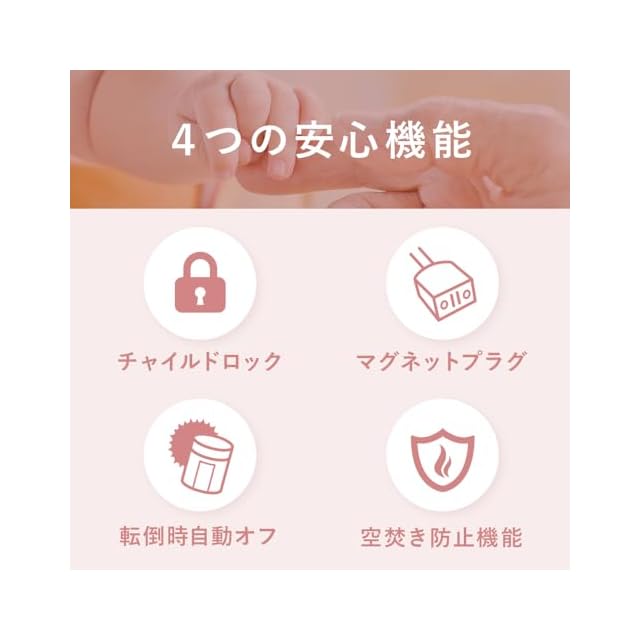 安全かつ簡単に使える機能。電源スイッチを入れると約2〜5分後にスチームが噴出。お湯が沸くまでにかかる時間が少なく、すぐ加湿できるのがポイント。タンクの水がなくなると自動的に加熱を停止する空焚き防止機能も付いているので安心。水タンクが空になった後に再度運転する際は、リセットボタンを押してランプを点灯させてください。