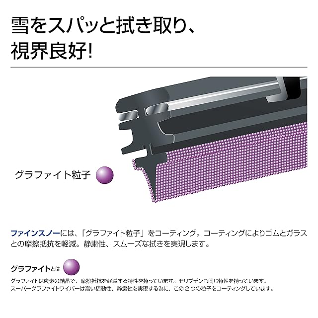 ファインスノーワイパーは、高品質天然ゴムを採用しゴム表面には摩擦抵抗を軽減する「グラファイト粒子(黒鉛)」をコーティングしています。不快な音、ビビりのないスムーズな払拭で雪、雨、泥ハネをスパっと拭き取ります。