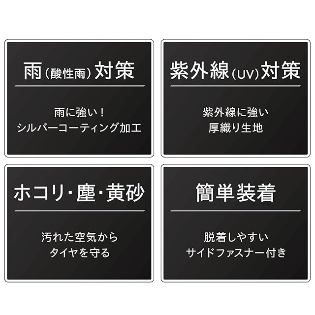 オフシーズンの「スタッドレスタイヤ」や「スペアタイヤ」の交換時期にはかかせない、タイヤを雨・紫外線から守る『タイヤ収納カバー(4本用)』。