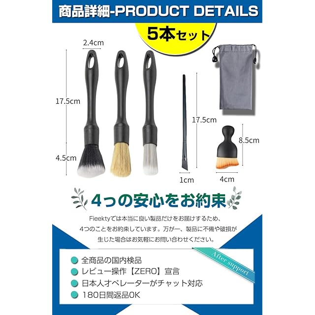 商品名:Fieekty 洗車ブラシ 5種類 5本セット ディテールブラシ ホイール ボディ用 車内掃除用 隙間掃除 傷つかない 洗車セット 洗車 筆ブラシ 洗車 刷毛 洗車グッズ カー用品 便利 柔らかい 豚毛 換気口 乾湿両用 筆タイプ(収納袋+取り扱い書付き)