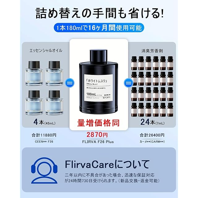 商品名:【2026新登場・180mL で 16 ヶ月持続】FLIRVA 車 アロマディフューザー 超音波霧化 静音 穴詰まりなし 粒子細かく 液溜まり防止【 8色雰囲気ライト 持続モード特許 自動ON/OFF 内蔵バッテリー コードレス アルミ合金】ホワイトムスクの香り フランス産天然香料 F26 Plus 車 芳香剤 車 消臭