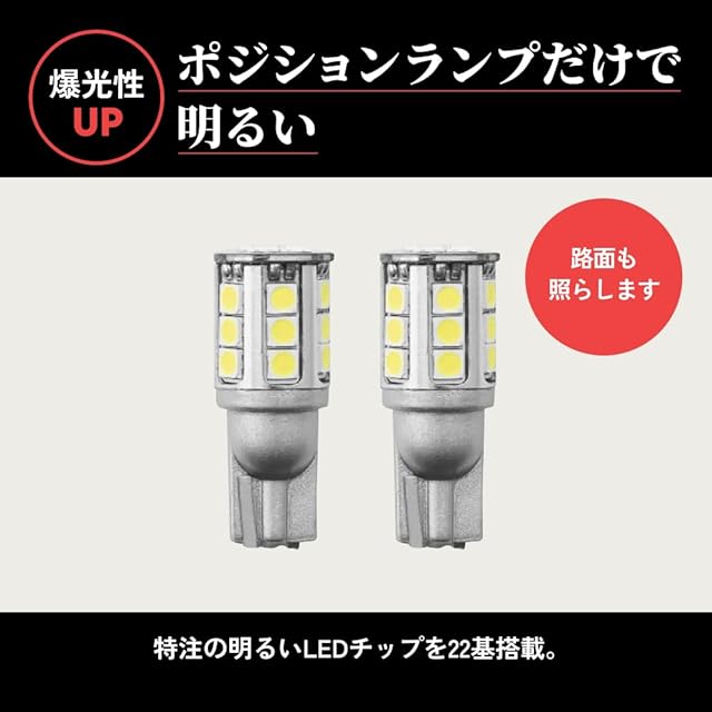 【仕様】T10 ウェッジ球 極性あり 【サイズ】全長:約31mm 全幅:約12mm【明るさ】1灯あたり2400lx(ルクス)※光源から1メートル先で測定 ※数値は車種やレンズ、取付の状態、バルブや測定器の種類によって変動します。 ※1種類のバルブで測定しています。【LEDチップ】特注の明るいLEDチップ 22基搭載【消費電力】9W / 1球 4.5W【電圧】12V車対応/24V車非対応【色】ホワイト 6500K【】2025年3月1日ご注文分より、1年→2年へと変更いたしました。 【当製品のサイズ】・当製品は純正T10より若干大きいサイズとなります。念のためご注文前にサイズのご確認をお願いいたします。※ハリアーZSU65には適合しません。