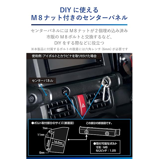 ジムニー(JB64)ジムニーシエラ(JB74)ジムニーノマド(JC74)のセンターエアコン上部にある純正パネルを取り外し、M8ナットが2個埋め込まれたパネルに変える商品です。専用デザイン/専用設計なので、ジムニーの内装にピッタリとフィットし、違和感なく取り付けられます。