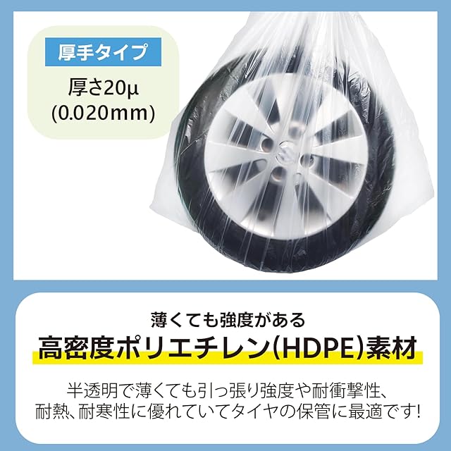 【薄手で耐久性のある袋】タイヤ袋の材質は高密度ポリエチレン。一般的なビニール袋より強度があり、裂けたり破れた利することが少なく、タイヤの保管に最適です。0.020mmという薄さでありながらしっかりとした強度があるタイヤビニール袋です。