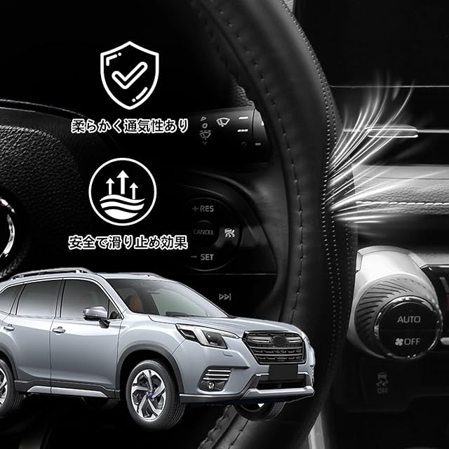 【適合車種】スバル に適用 フォレスター Forester 対応。 【セット内容】ハンドルカバーx1PCS [合計:1pcsセット]。 一年中使える、快適なドライブ:一年中いつでも使用可能快適なドライプ 汗を吸収し、通気性抜群 手のひらの汗の悩みを改善 快適なドライブをサポート 取付前と取付後の比較: 取付前:素材は滑らかで一般的で、質感に欠けます 車両本体が傷つきやすいです 取付後:外観をアップグレードし、優れた質感と保護機能を兼ね備えています このハンドルカバーで、常にハンドルを乾燥状態に保ち、快適なドライブをサポートします。手のひらの汗や湿気をしっかり吸収し、どんな天候でも清潔感を保ちます。長時間の運転でも快適さを維持でき、手に馴染む柔らかい素材が、毎日のドライブをより楽しくします。 簡単取り付け&お手入れもラクラク: 特別な工具や専門知識は必要ありません。簡単なステップでステアリングカバーを取り付けることができ、誰でもすぐに装着可能です。テップで: 中心のロゴマークを揃えます → 一番上からハンドルにかぶせていきます → センターの位置を途中で 調整しながらはめます →ステアリングの下側を引っ張りながら 後にしっかりはめ込んで完成です 高品質な素材と精密な工芸:防水、防汚、摩耗防止、耐老化、滑り止め性向上、これにより安定したグリップ感を保ち、通気孔デザインを採用しており、手汗のたまりを防ぎ、ドライブ中も快適な状態を保ちます、快適なドライブをサポートします。 特別デザイン: 専用アイコン:専用アイコン、車内のアクセントとしてもぴったりです。ステアリングカバーとしてだけでなく、内装の美しさを引き立てるアイテムとなります。 上質の本革:本革高級車のインテリアによく使われる素材で、肌にやさしく通気性に優れています。寒い時期に手のひらに触れると暖かくなります。同時に、長時間運転しても疲れや蒸れを感じることはありません。オールシーズン対応、夏にハンドルの熱さや冬にの冷たさを軽減します。 スタイリッシュデザイン:このステアリングカバーは、現代的でシンプルなデザインが特徴で、流行に敏感な方にぴったりです。 快適な握り心地で運転が楽に:柔らかい質感と完璧にフィットするデザインにより、ハンドルを握るたびに快適なドライブ体験を提供し、どんな運転環境でも楽に運転できるようサポートします。