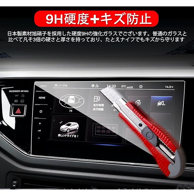 <b>幣品はruiya製、車用カスタムの強化・カーナビ保護フィルムです。ご購入前、必ず車種をご確認ください。</b><br><br><b>ナビタイプ:</b> Volkswagen 純正インフォテイメントシステム“Discover Pro”9.2インチの大型モニター <br><br><b>適合車種:</b><br><br>新型 VW フォルクスワーゲン ポロ AW型 (2022.6~現行) <br><br><b>硬度9H:</b><br>日本製素材旭硝子を採用した硬度9Hの強化ガラスでキズから守ります。<br><br><b>HDクリア:</b><br>高透明度のガラス素材を採用しており、保護しながらカーナビの液晶画面を損なわなくて、綺麗に画像を全て展示することができます。<br><br><b>飛散防止処理:</b><br>万が一フィルムが破損した場合でも、ガラスが飛び散らず張り付いた状態になるので安全です。<br><br><b>精巧なエッジ加工:</b><br>精巧なエッジ加工により、引っ掛かり感がなく気持ち良い滑らかな質感を実現します。<br><br><b>自己吸着タイプ:</b><br>自己吸着タイプ、気泡が入りにくくて、初心者でも簡単に貼り付けます。<br><br><b>ARコーティング:</b><br>表面コーティング加工されており、撥水性や疎油性に優れ、汚れや指紋などがついても簡単に綺麗に拭き取ることができます。<br><br><br><b>※カーナビ用ガラスフィルム貼付け操作注意事項※ </b><br><br>1.付属の吸盤を使ってフィルムの正面の一角に吸着します。 <br><br>2.フィルム裏面のシールを外しかけて、フィルムをナビに合わせって粘着を準備します。<br><br>3.前に吸盤で吸着したフィルムの一角はナビの一角に合わせって、少しずつ力をいれて、フィルムをパッチリ貼り付けてください。 <br><br>4.もし気泡が入った場合には、指か吸盤か気泡を外に押し出してください。貼り直す場合はありますが、強く剝がさないでくださいね。<br><br>※<b>安心な3年メーカーサービス&返品・返金」:</b>※弊社の保護フィルムは3年間の安心が付き、3年間以内に何にか不具合・不良があれば交換または全額返金などのサービスを提供致しますので、ご安心してお買い求めください。製品に何か不明点がありましたら、ご連絡頂ければ迅速に対応させて頂きますので、いつでもお気軽にメールでご連絡ください。