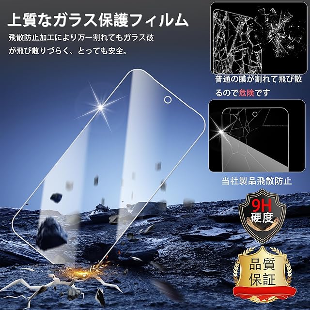 【日本素材製】日本製旭硝子素材の採用、表面強度指数は9Hで、一般的なPETとフィルムの3倍、傷がつきにくい専用強化ガラス。飛散防止加工により万一割れてもガラス破片が飛び散りづらく、とっても安全!