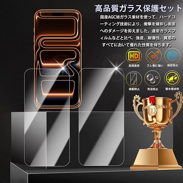 商品名:HKKAIS ガラスフィルム iPhone 17 Pro 用の 日本旭硝子製素材 高い透過率 硬度9H 貼り付け簡単 強化ガラス フィルム ガイド枠付き【2 枚セット】