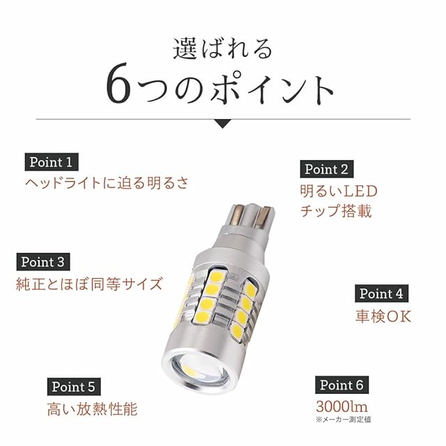 【選ばれる6つのポイント】①ヘッドライト級の明るさ ②明るいLED搭載 ③高い放熱性能 ④純正とほぼ同等サイズ ⑤車検OK