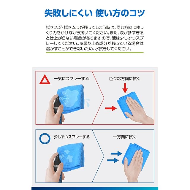 ガラスに残ったクリーナー成分が弾かれずにレベリング(均一化)し、ゆっくり乾燥するので拭きスジ・拭きムラが残りません。