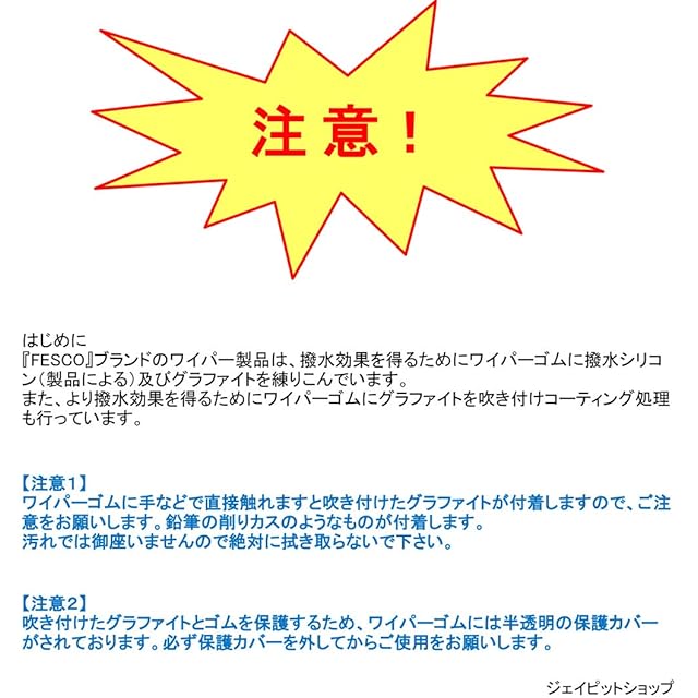 『Fesco フェスコ』ワイパーブレードは、<br> 欧州、北米メーカーにOEM供給する、ISO16949を取得したOEM製造メーカーとのブランドライセンス契約により、<br> 日本で企画開発された高品質ワイパーブレードメーカーです。<br><br> 【グラファイト+モリブデンのダブルコーティング!】<br> ビビリ、拭きムラ、筋状拭き残しの無い抜群の拭きで視界を確保!<br> 高品質の天然ゴムをベースとした、特殊配合成形ゴム(ノーマルラバー)に<br> グラファイト(炭素微粒子)二硫化モリブデン(MOS2)を二層コーティング!
