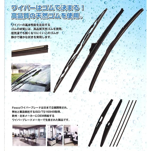 『Fesco フェスコ』ワイパーブレードは、<br>欧州、北米メーカーにOEM供給する、ISO16949を取得したOEM製造メーカーとのブランドライセンス契約により、<br>日本で企画開発された高品質ワイパーブレードメーカーです。<br><br> 【特殊シリコン+グラファイト2層の撥水効果!】<br> ガラス面が乾いた状態で、ワイパーを5分作動させるだけ撥水コーティング完了。<br> 雨をはじき、すっきりクリアな視界が得られます。<br>特殊シリコンゴムにより、シリコンオイルがガラス面に付着。<br> そのシリコンオイルが雨を水玉に変え、優れた撥水効果を発揮します。<br> また、潤滑性が高く、またやわらかい性質を持っているため、ガラス面との摩擦効果を低減。<br> ビビリ音の無いスムーズな拭き取り性能も実現します。<br><br> 【撥水コーティングの仕組】<br> ・ワイパーを動かすことで表面に撥水コーティング<br>・(低速走行時)コーティングが雨を水玉へ変えて弾く<br>・(高速走行時)水玉をワイパーで弾き飛ばす