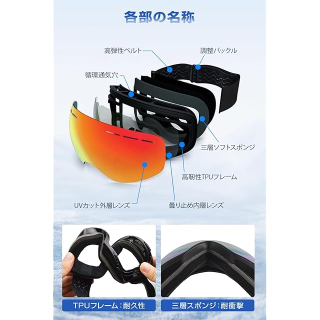 【柔軟TPUフレーム&3層スポンジ構造】 高品質TPU素材を使用したフレームは柔らかく、低温下でもしなやかで割れにくい仕様。顔に触れる部分は、通気性とクッション性に優れた3層スポンジ構造で、暖かく快適な装着感を実現します。 密閉性の高い設計で、全天候対応 防風・防雪・防塵・耐衝撃性能を強化。球面レンズが転倒時の衝撃を軽減し、安全性を高めます。クリアな視界と高い保護性能で、雪山スポーツの魅力を存分に楽しめます。