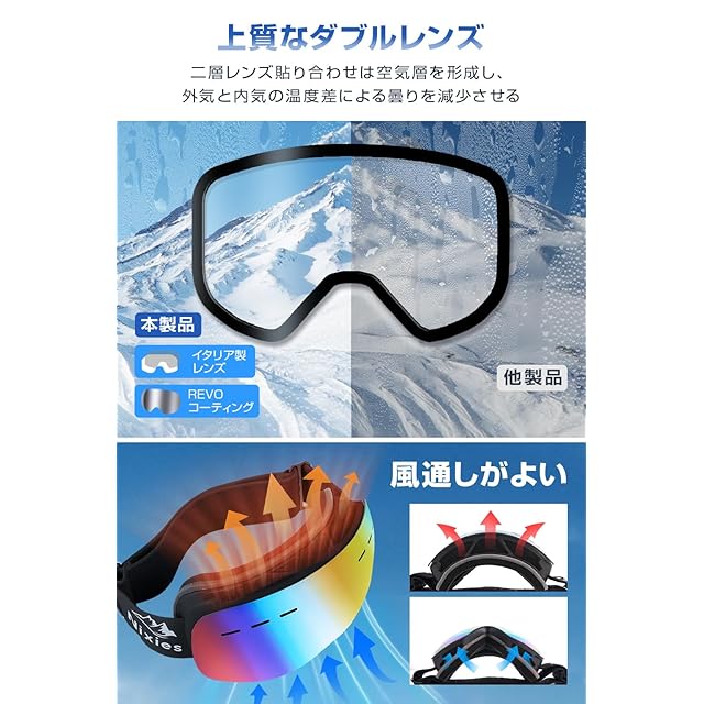 【高性能球面ダブルレンズ】 最新の球面ダブルレンズ構造 曇り止めを採用。インナーレンズには高耐久の防曇素材と特殊コーティングを施し、エアギャップによって断熱性を強化しています。アウターレンズは防水コーティングにより雪や氷の付着を防ぎ、さらに耐擦傷性を高める超硬加工を実現。上下のベンチレーション設計により、暖かく湿った空気を排出し、新鮮な空気を取り込みます。これにより曇りを防ぎ、常にクリアな視界を確保。優れた防曇性・耐擦傷性・100%UVカット・耐風性を兼ね備えた高性能ゴーグルです。