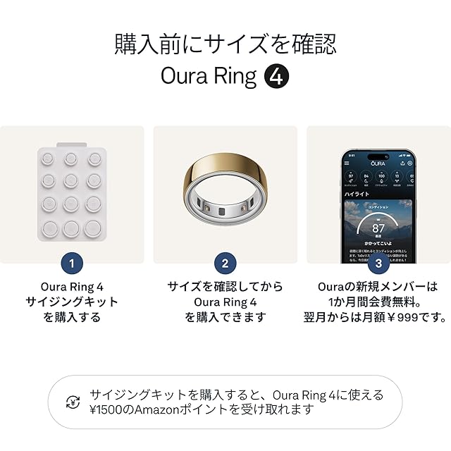 サイジングキット購入で「Oura Ring 第4世代」購入時に使える¥1,500のクレジットを進呈(サイジングキットは返品不可・規約あり)。