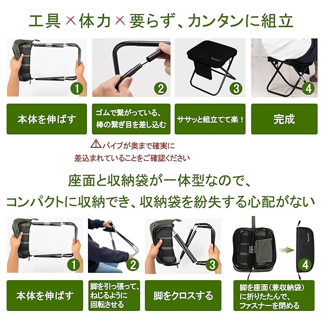 【コンパクト】座面自体が収納袋に変身するので、超コンパクトで、お出かけの荷物にならない。既存の折りたたみ式椅子よりも、更に椅子の座面自体が収納ポーチに変身し、収納バッチリです。スペースがとれなく、収納袋紛失の心配もいりません。リュックに入るくらいのコンパクトさなので、どこへでも楽に持ち歩きが可能。 【注意事項】使用前に必ず、パイプの接続部分が全て奥まで差し込まれているかご確認ください。パイプが未装着のままでの使用は事故やゴムが切れる危険性がありますので、ご注意ください。