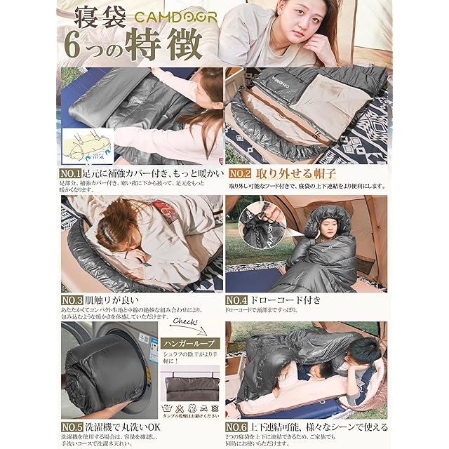 ✅【2025年革新版寝袋 冬用&取り外せる帽子&2個連結使用】✅革新取り外し可能なフード付きで、寝袋の上下連結をより便利にします。✅裏地には毛布とステッチデザインを採用し、保温性を確保しながら、寝袋使用時に毛布が乱れて整理しにくい問題を解消し、使用時の快適性を高めています。✅同じモデルの寝袋なら2つ上下に繋げ、 最大2枚で家族4人(子供2人)でご利用頂けます。✅足部分に補強カバーを採用。寒い夜でも下からしっかり包み込み、足元の暖かさを守ります。✅Camdoor 寝袋には 6D ファイバー中空化学繊維が充填されており。✅型崩れしにくく、洗濯しても伸び縮みせず、伸縮性に優れた繊維です。✅シュラフ 冬用の足元だけ開けてシュラフ内の通気性を高めて、温度や湿度を簡単に調整することができます