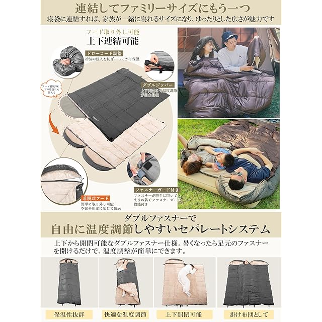 ✅【実用的な封筒型デザイン&シュラフ 連結可能】封筒型の最大特徴は、フルオープンができますのでマットや掛布団としてのご使用も出来ます。同じモデルの寝袋なら2つ上下に繋げ、 最大2枚で家族4人(子供2人)でご利用頂けます。革新取り外し可能なフード付きで、寝袋の上下連結をより便利にします。✅【足元補強カバー付きで】足部分に補強カバーを採用。寒い夜でも下からしっかり包み込み、足元の暖かさを守ります。頭部を絞り保温力を上げ、フードのサイズ調整で温かさをキープします。【L字ジッパー】就寝中の温度調節に不可欠な、両側から開閉可能できるダブルファスナー採用している。足元だけの開閉可能、暑くなってきた時に温度調節が可能、熱がこもってムレやすい気温でも快適に過ごせる。