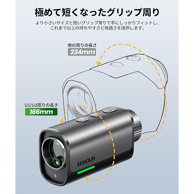 【EENOUR初 単眼ゴルフ距離計】単レンズU2距離計は小型でありながら、グリップ部分の周りが更に短くなり、どんな手の大きさでも自由に調整してフィットし、これまで以上の持ちやすさと快適さを提供し、より安定した計測と高い操作性を実現します。