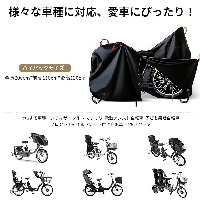 自転車カバー 厚手 防水 子供乗せ対応 500Dオックス ファスナー付き 電動自転車対応 破れにくい UVカット 風飛び防止バックル 収納バッグ 24〜32インチ対応 サイクルカバー(ハイバック)