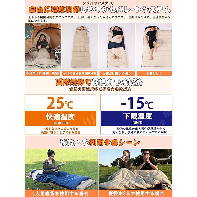 【空間がより広く仕上げました】封筒タイプの寝袋の中にはスペースがあり、その中で手足を伸ばしたり寝返りを打ったりすることができます。帽子は収縮ひもで閉じることができて、暖かさを維持して寒さを防止します。足から肩まで全開になるダブルジッパー仕様で、寝袋を広げてマットレスや布団としても使えます。普通の寝袋よりも幅があって長いのですゆったりとしたサイズで快適な睡眠スペースを提供します。子どもと一緒に使っても十分です。