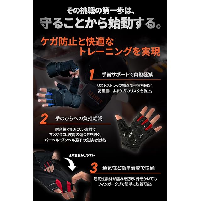 【着脱のしやすさの追求】 トレーニング後の汗でグローブがべとついてしまい、外すのに苦労した経験はありませんか? ALLOUTトレーニンググローブは便利なフィンガータブ付。トレーニング後の汗ばんだ手でも、フィンガータブのおかげで、ストレスなくグローブを着脱できます。