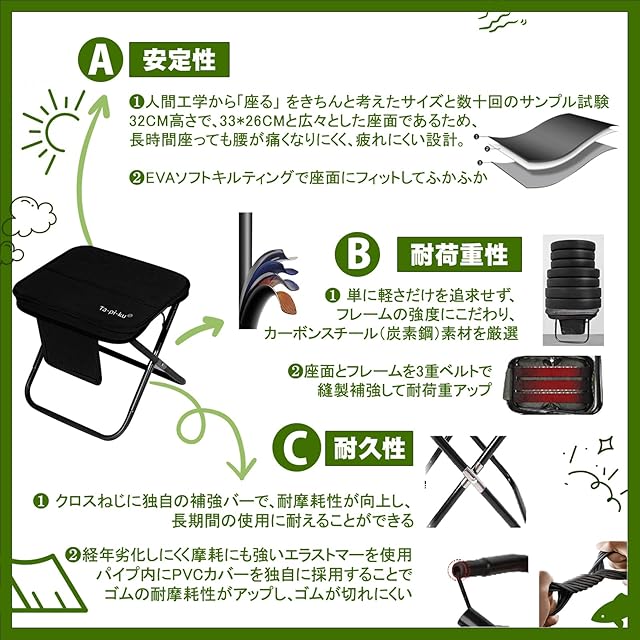 【タフで業界最高水準の耐久性】軽く、コンパクトだけでなく、とても頑丈です。耐重性・耐久性・耐水性を大幅に向上しています。また、座面にはカチオン生地を採用し、撥水性・耐摩擦性・通気性を向上し、座った際に沈み込みづらく、より強靭な座面でより長く安心してお使いいただけます。この軽さとコンパクトさで耐荷重は驚きの120kg!幅広いの方にご使用いただけます