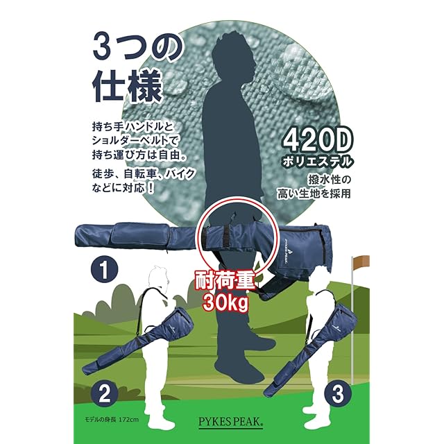【持ち運びやすい3WAY仕様】 厚さ2cmのショルダーパッドが肩への負担を軽減し、安定した持ち運びをサポートします。ショルダーベルトは身長やクラブの重さに合わせて長さ調整が可能。肩掛け、手持ちなど、移動手段(徒歩、自転車、バイク)に合わせて持ち方を変えられる実用的な設計です。
