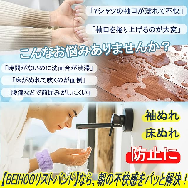 ▲【手首に流れてくる水を吸水】手首にはめるだけで、洗顔するときに手首に流れてくる水を吸収してくれるので服の袖が濡れず、不快感なく気持ちよく洗顔ができます。