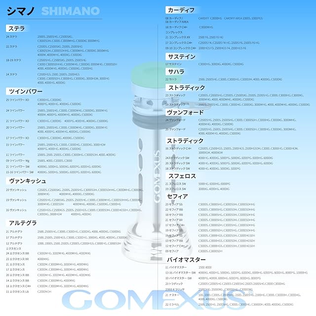 【対応機種シマノ】20 ヴァンフォード 2500-5000、19 ヴァンキッシュ 2500-50000、16 12 ヴァンキッシュ 2500-4000、12 レア二ウム CI4+ 2500-4000、09 レア二ウム CI4+ 2500-4000、11 バイオマスター 2500-8000、13 - 16 バイオマスター SW 4000-10000、10 バイオマスター 6000-8000、20 ツインパワー 2500-5000、21 17 ツインパワー XD 3000-5000、15 11 08 ツインパワー 2500-4000、21 15 ツインパワー SW 4000-6000、09 ツインパワー Mg 2500-4000、19 セフィアSS 3000、17 15 12 10 09 08 セフィア 3000、18 13 セフィア BB 3000、19 スフェロス SW 3000-4000。