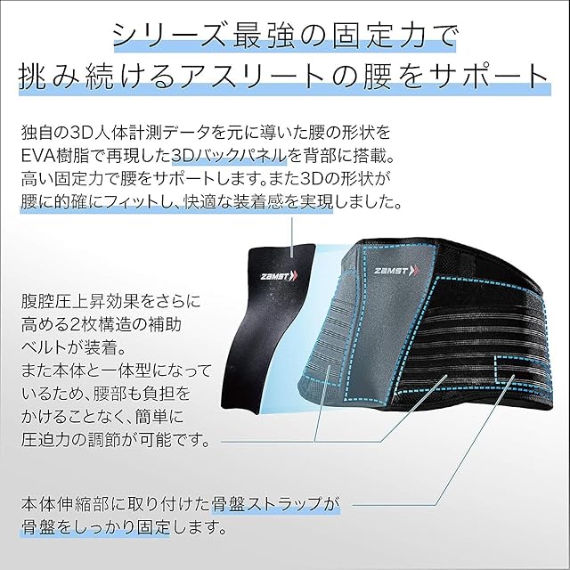 【固定力重視のハードタイプ】ZWシリーズの中で最も高い固定力で、腰全体をしっかりサポート。 3Dバックパネルと2枚構造の補助ベルトにより、高い固定力を実現しました。