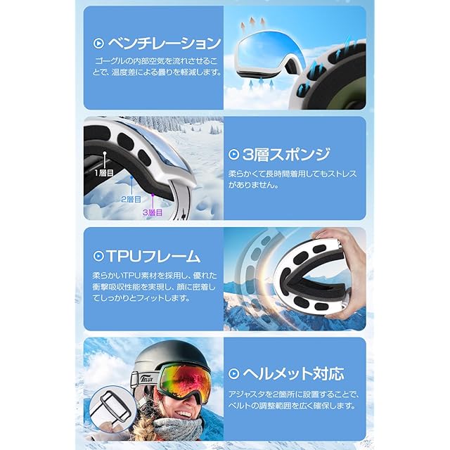 【人間工学設計&耐衝撃】このスノーゴーグルは人間工学に基づいて設計されており、アジア人の顔の特徴に適合して密着します。長時間着用してもずれず、違和感やストレスがないようになっています。顔に当たる部分には 3 層の柔らかいスポンジが使われ、フィット感が抜群で、衝撃を吸収して顔を守り、寒さから目の周りを守ります。また、ゴーグルのフレームには良質な TPU が採用され、柔らかくて曲げても形が崩れず、寒い天気でも柔軟性を保ちます。