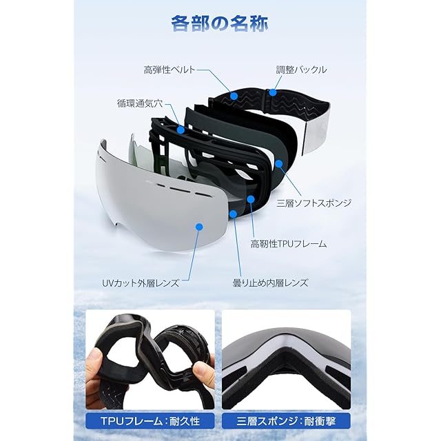 【柔軟TPUフレーム&3層スポンジ構造】 高品質TPU素材を使用したフレームは柔らかく、低温下でもしなやかで割れにくい仕様。顔に触れる部分は、通気性とクッション性に優れた3層スポンジ構造で、暖かく快適な装着感を実現します。 密閉性の高い設計で、全天候対応 防風・防雪・防塵・耐衝撃性能を強化。球面レンズが転倒時の衝撃を軽減し、安全性を高めます。クリアな視界と高い保護性能で、雪山スポーツの魅力を存分に楽しめます。